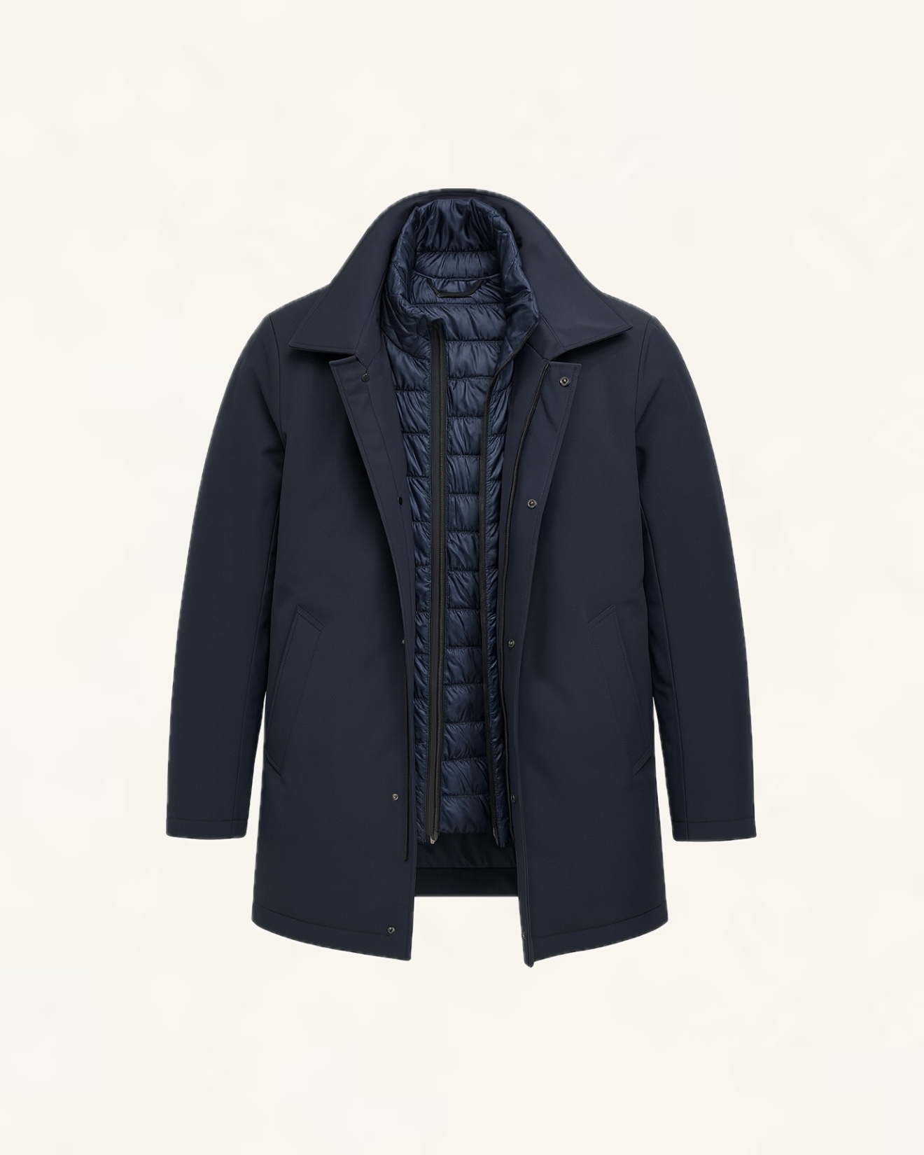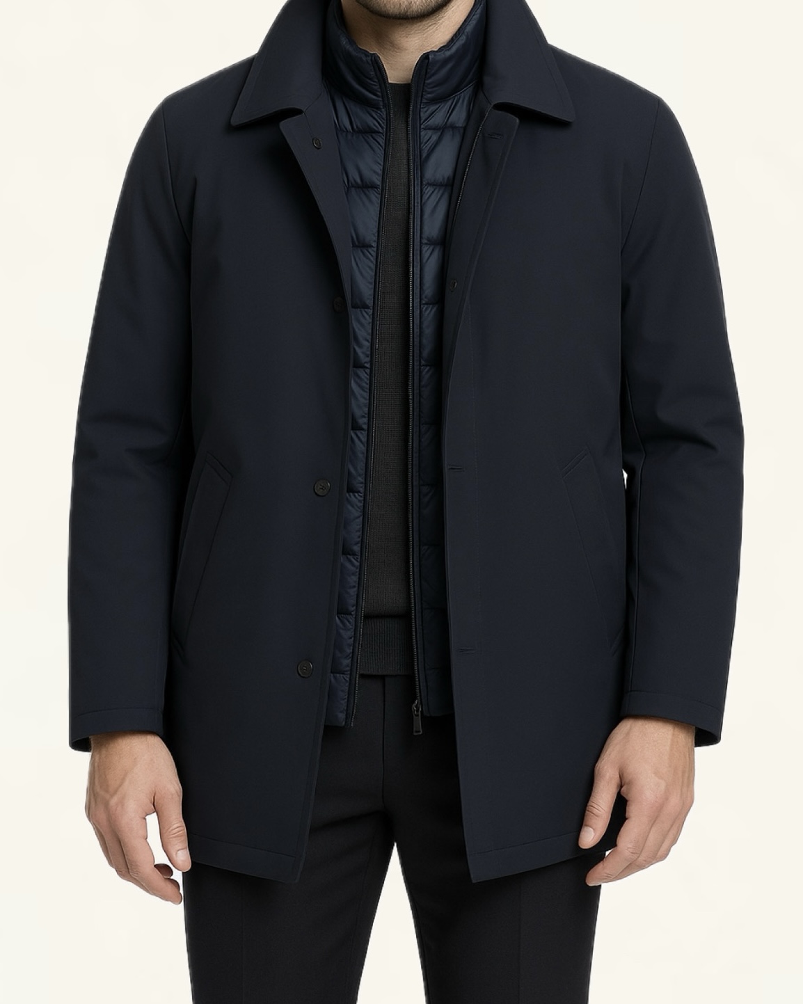 Crafted from Benini’s signature Micro Tech fabric, the outer shell offers lightweight protection, a clean drape, and a polished silhouette. Inside, a detachable goose-down padded vest provides superior insulation without compromising the coat’s streamlined look.